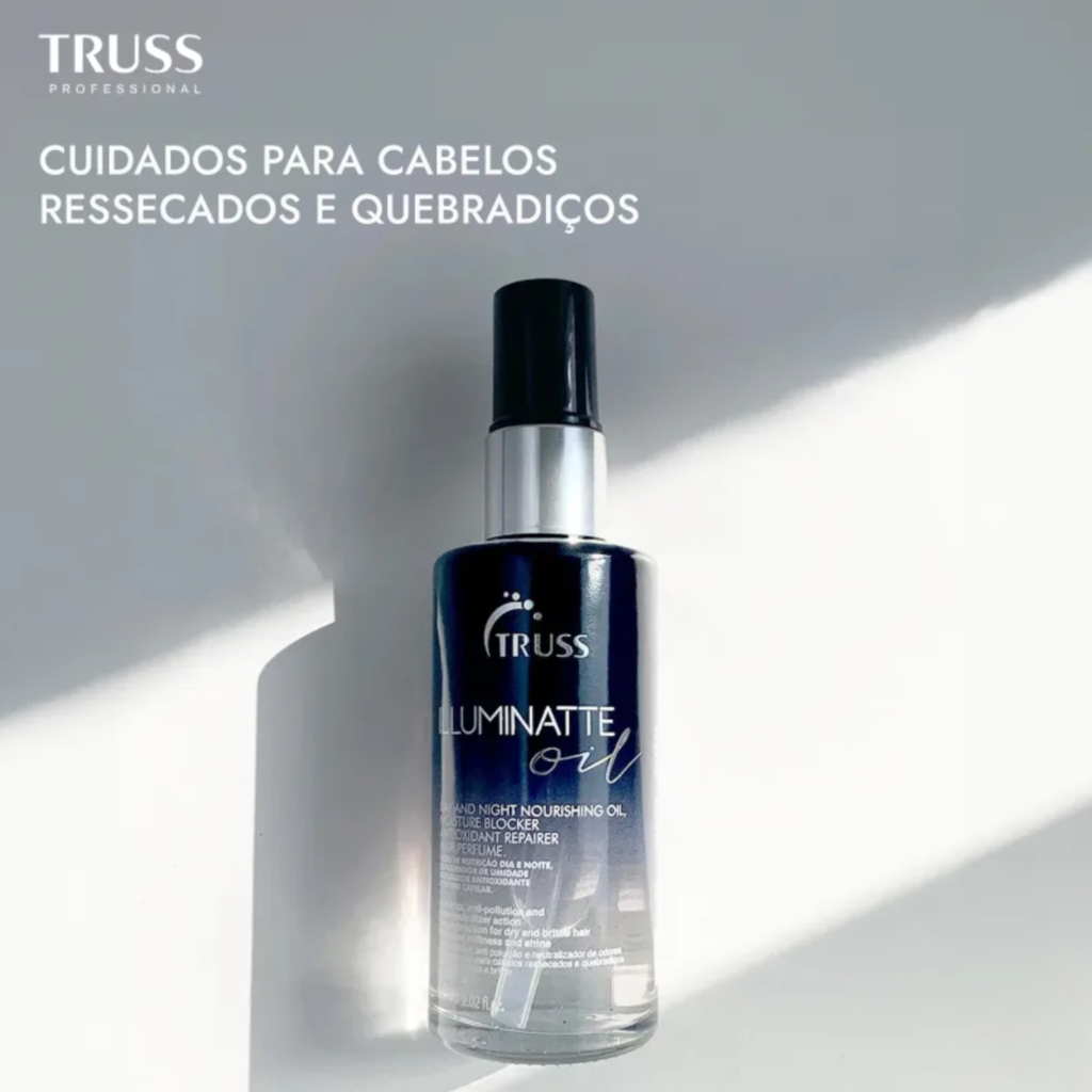 Óleo para cabelos ressecados e quebradiços. TRUSS Illuminatte Oil confere uma intensa ação antifrizz, mantendo os fios alinhados.